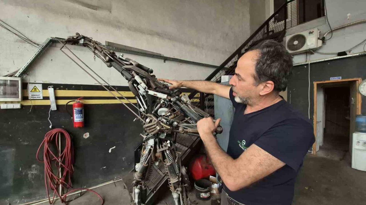 Küçük Sanayi Sitesi'nde motor tamirciliği yapan 54 yaşındaki Murat Çetin, 2019 yılından bu yana otomobil, motosiklet ve bisikletlerin kullanım ömrünü tamamlamış parçalarından figürler yapıyor. Çetin, çöpe gidecek olan amortisör, zincir, dişli ve benzeri yüzlerce atık metal parçayı atölyesinde bir araya getirerek geri dönüşüme katkı sağlıyor.
