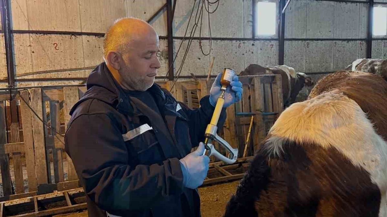 Bayburt'un Aydıntepe ilçesinde büyükbaş hayvanlara yönelik şap aşılama ve buzağı küpeleme çalışmaları, İlçe Tarım ve Orman Müdürlüğü bünyesinde görevli veteriner hekimler tarafından sahada titizlikle yürütülüyor.