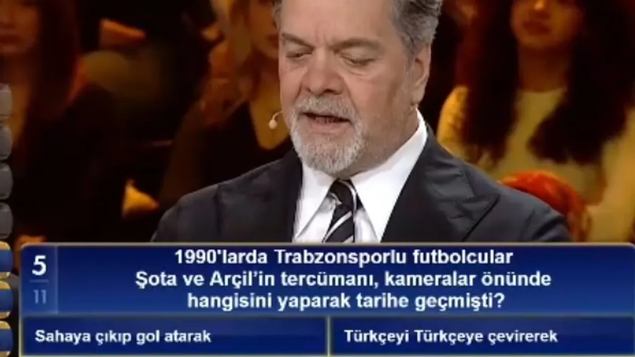 TÜRKÇE'Yİ TÜRKÇE'YE ÇEVİRMİŞTİ! Programda yarışmacıya; “1990’larda Trabzonsporlu futbolcular Şota ve Arçil’in tercümanı, kameralar önünde hangisini yaparak tarihe geçmişti?” sorusu soruldu. Sosyal medyada hızla yayılan bu an, Trabzonspor tarihinin en ilginç ve komik anılarından birini tekrar canlandırdı. Dönemin tercümanı, Şota’nın gayet net bir şekilde Türkçe konuşmasına rağmen, kameralar önünde bu sözleri tekrar Türkçe olarak özetleyerek dünya yayıncılık tarihine geçecek bir "çeviriye" imza atmıştı.