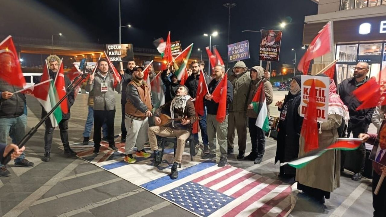 Çarşı AVM’de faaliyet gösteren yemek zinciri şubesinin önünde sazlı sözlü eylem düzenleyen grup üyeleri, “Kıyamete kadar boykot!”, “Katil destekçisi defol”, “Ey zalimler yenileceksiniz! Ve cehenneme sürüleceksiniz!”, “Almazsak ölmeyiz, alırsak ölecekler! Boykot ürünü alma, zulme ortak olma” yazılı pankartlarla tepkilerini dile getirdi.