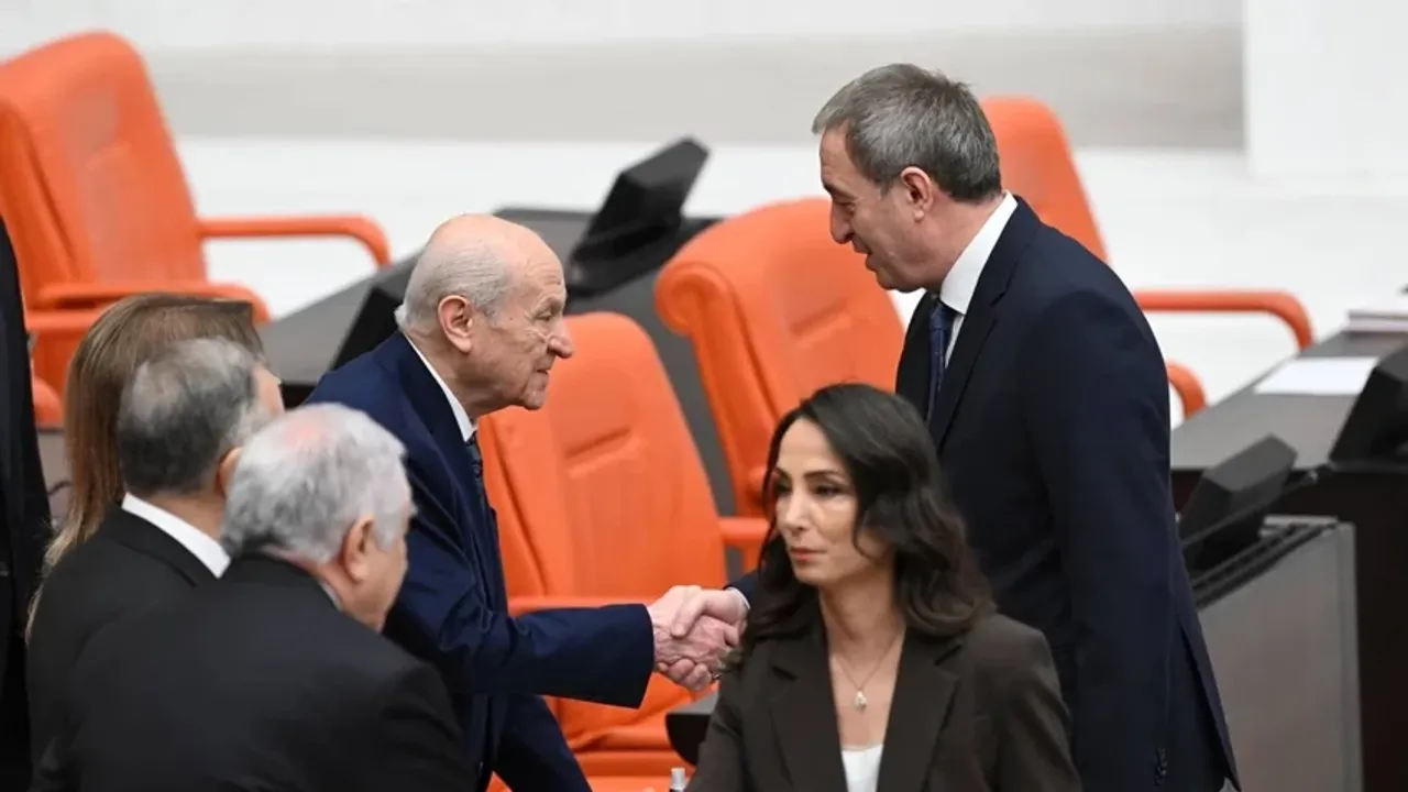 Gene Kurul'da CHP lideri Özgür Özel ve DEM Parti Eş Genel Başkanları Tülay Hatimoğulları ve Tuncer Bakırhan'la da tokalaşan Bahçeli, Bakırhan'ı Genel Kurul'daki konuşmasından dolayı tebrik ederek çay davetinde bulundu.