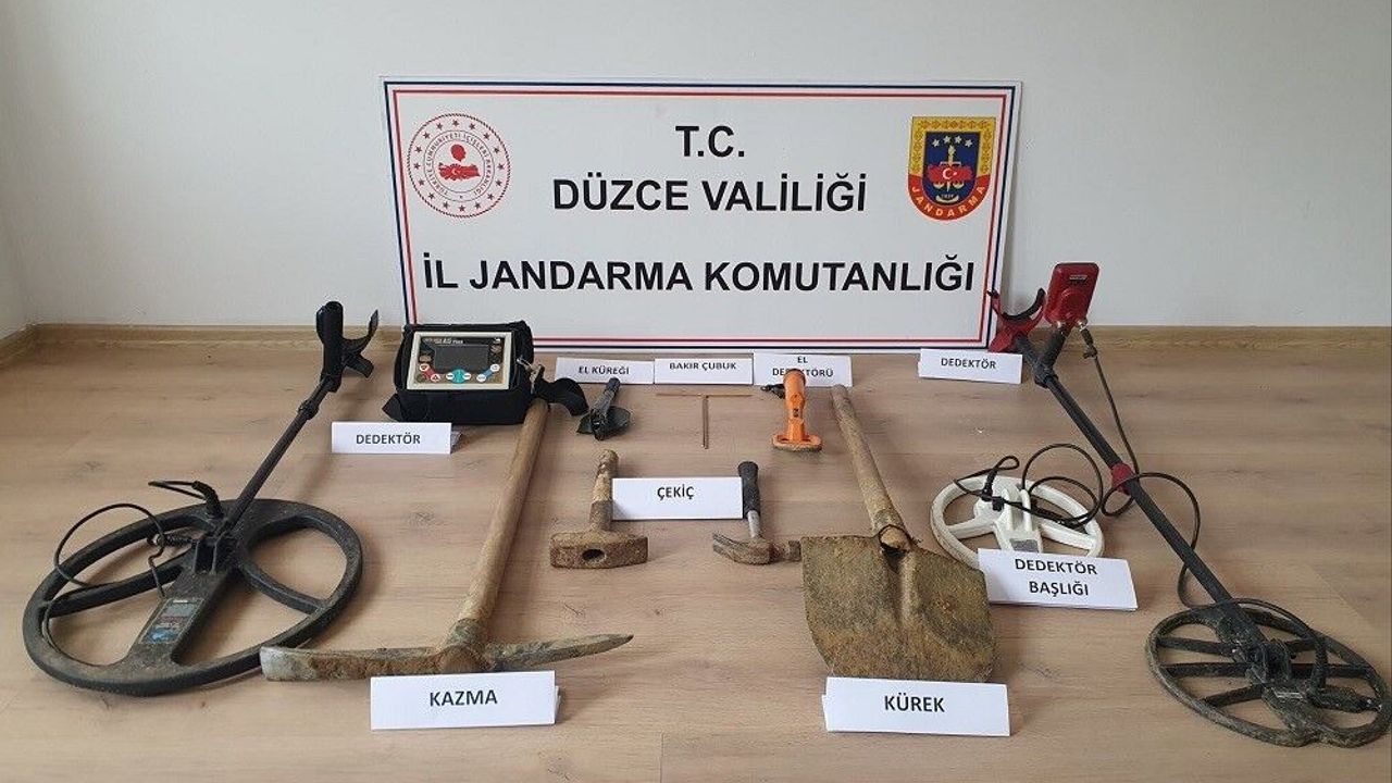 Düzce İl Jandarma Komutanlığı'na bağlı Cumayeri İlçe Jandarma Komutanlığı ekipleri devriye sırasında ormanlık alanda hareketlilik olduğunu fark etti. Alanda yapılan incelemede kaçak kazı yapan 3 kişi ile birlikte 3 adet dedektör, 2 adet kürek, 1 adet kazma, 2 adet bakır çubuk, 2 adet çekiç, 3 adet şarj aleti ele geçirildi.