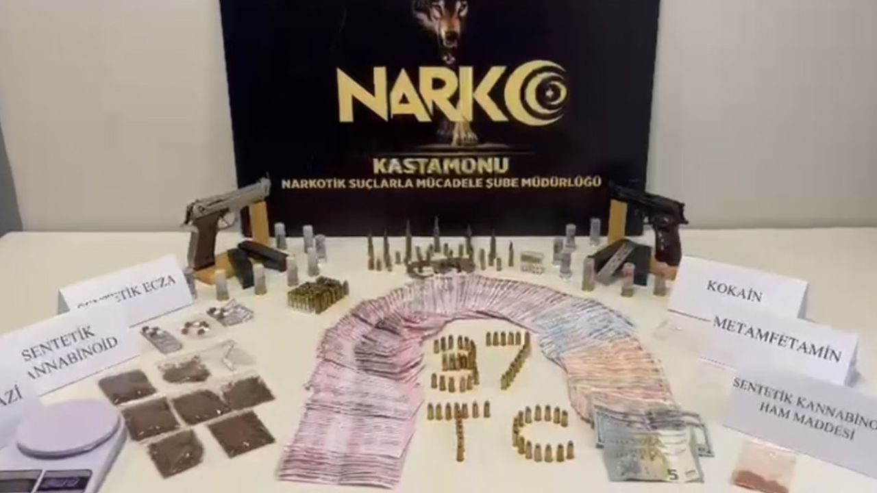 Edinilen bilgiye göre, Kastamonu İl Emniyet Müdürlüğü Narkotik Suçlarla Mücadele Şube Müdürlüğü ekiplerince, il merkezi ve Araç ilçesinde uyuşturucu madde ticareti yapan şahıslara yönelik operasyon düzenlendi. Tespiti yapılan 21 şüpheli şahsa ait 23 adrese eş zamanlı düzenlenen operasyonda, 9,34 gram kannabinoid ham maddesi, 35,46 gram kannabinoid, 1,01 gram içime hazır 1 adet sigara, 13 adet sentetik ecza hapı, 0,09 gram kokain, 1 adet ruhsatsız tabanca, 1 adet kuru sıkı tabanca, 5 adet tabanca şarjörü, 147 adet farklı çaplarda tabanca fişeği, 7 adet farklı çaplarda uzun namlulu silah fişeği, 5 adet kuru sıkı fişeği, 16 adet av tüfeği kartuşu, uyuşturucu madde ticaretinden elde edildiği değerlendirilen 33 bin 200 TL, 1 adet hassas terazi, 1 adet uyuşturucu ticaretine ilişkin not defteri ve 1 adet kelepçe ele geçirildi. Operasyonda 20 şüpheli yakalanarak gözaltına alındı.