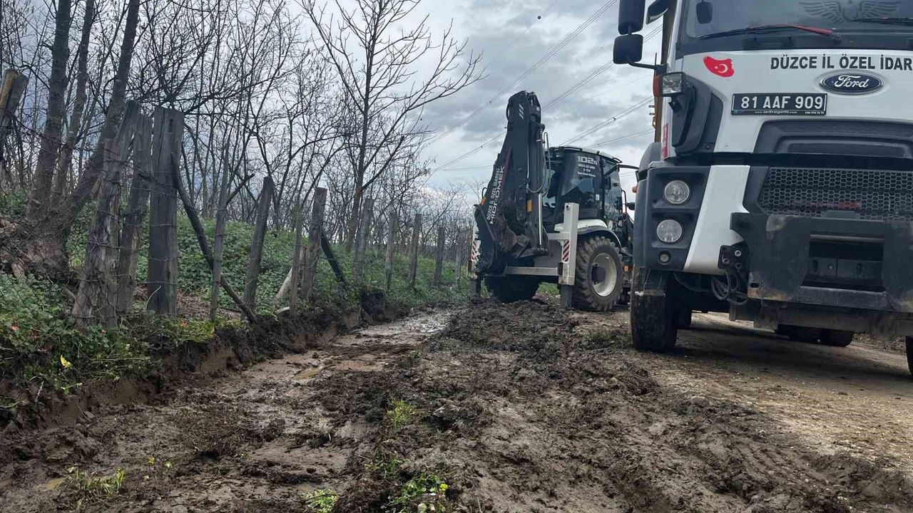 DÜZCE (İHA) - Düzce Yol ve Ulaşım Hizmetleri Müdürlüğü ekipleri köylerde yol güvenliğini arttırmak için bir yandan yolları iyileştirirken bir yandan da yol kenarlarına yağmur suyu akarı yapıyor.