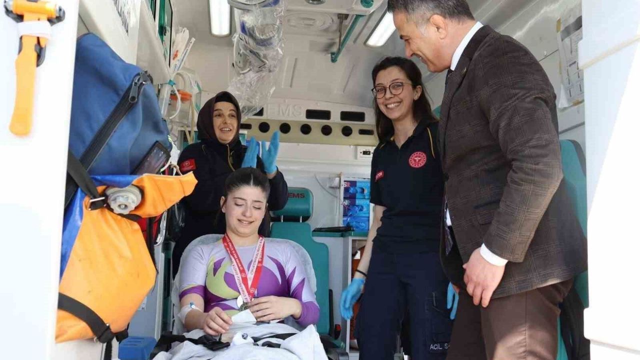 Çorum'da gerçekleştirilen Okullararası Artistik Cimnastik İl Birinciliği Yarışması'nda dereceye giren genç sporcuya kazandığı madalyaları, sakatlanması sebebiyle ambulansta verildi.