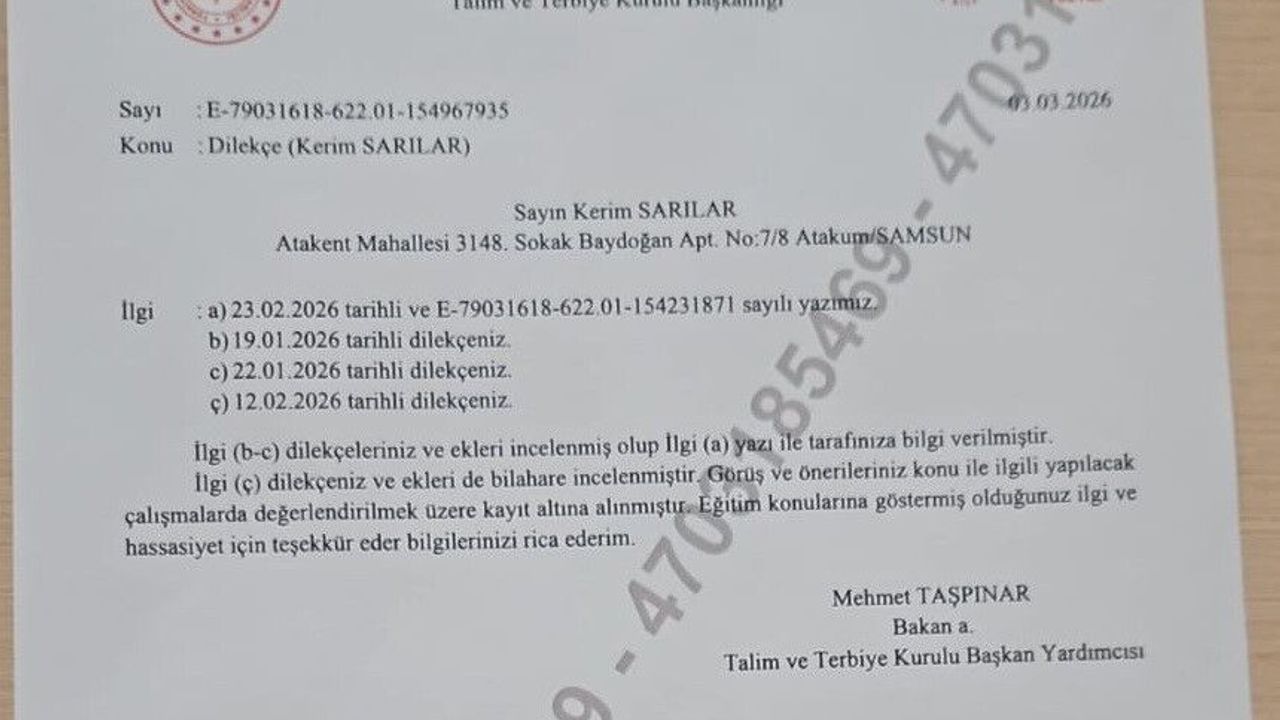 Bakanlık tarafından gönderilen yazıda, Sarılar'ın farklı tarihlerde ilettiği dilekçelere atıf yapılarak başvurunun detaylı şekilde incelendiği ifade edildi. Yazıda ayrıca, eğitim konularına gösterilen ilgi ve hassasiyet nedeniyle teşekkür edilerek, başvuru sahibine bilgilendirme yapıldığı kaydedildi.
