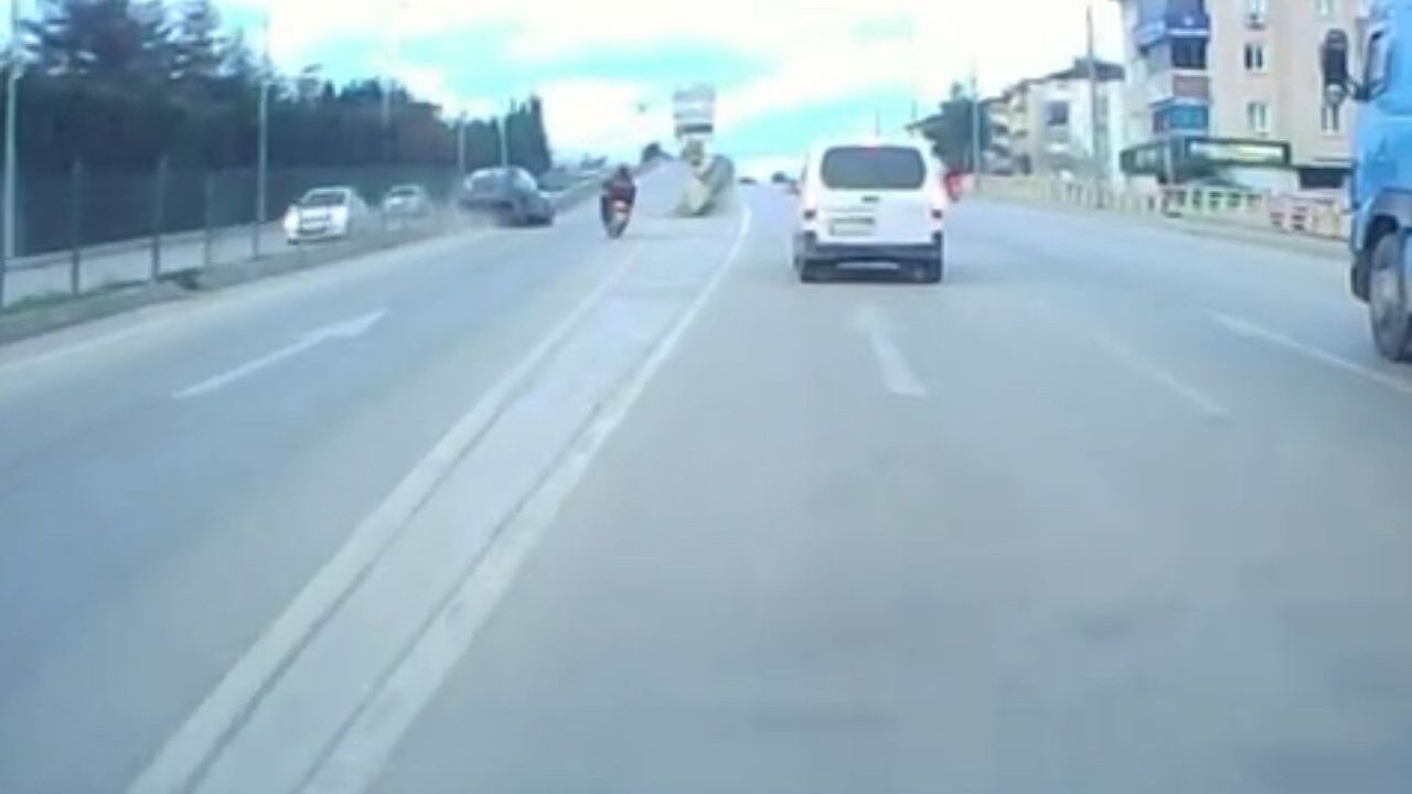 Karabük'te ani manevra yapan motosiklete çarpmamak için direksiyonu kıran sürücünün kontrolünden çıkan otomobil refüje çarptı. Kaza anı araç kamerasına yansıdı.