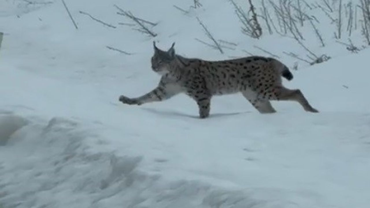 Karlı arazide görülen vaşak, yolun karşısına geçmeye çalıştığı sırada o güzergahtan aracıyla ilerleyen Vedat Özeler'in dikkatini çekti. Vaşağı cep telefonu kamerasıyla kayda alan Özeler'in görüntülerinde, iri cüsseli vaşağın yolun karşı tarafına geçtiği görülüyor.