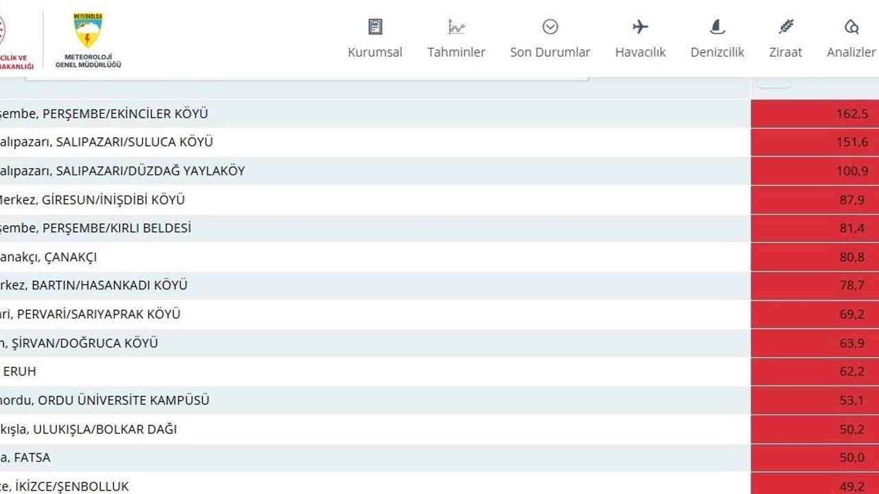 Meteoroloji Genel Müdürlüğü verilerine göre Ordu'nun Perşembe ilçesi Ekinciler Mahallesi, gün içerisinde aldığı 162,5 mm yağış ile Türkiye'de en çok yağış alan bölge oldu.