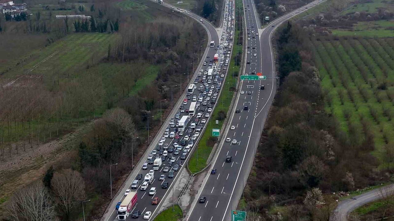 Anadolu Otoyolu'nun Düzce geçişinde, meydana gelen maddi hasarlı ve yaralamalı trafik kazaları nedeniyle dönüş yolunda yoğunluk artarak devam ediyor.