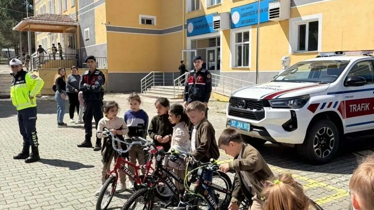 Sinop'un Saraydüzü ilçesinde jandarma ve emniyet trafik ekipleri tarafından anaokulu ve ilkokul öğrencilerine uygulamalı trafik güvenliği eğitimi verildi.