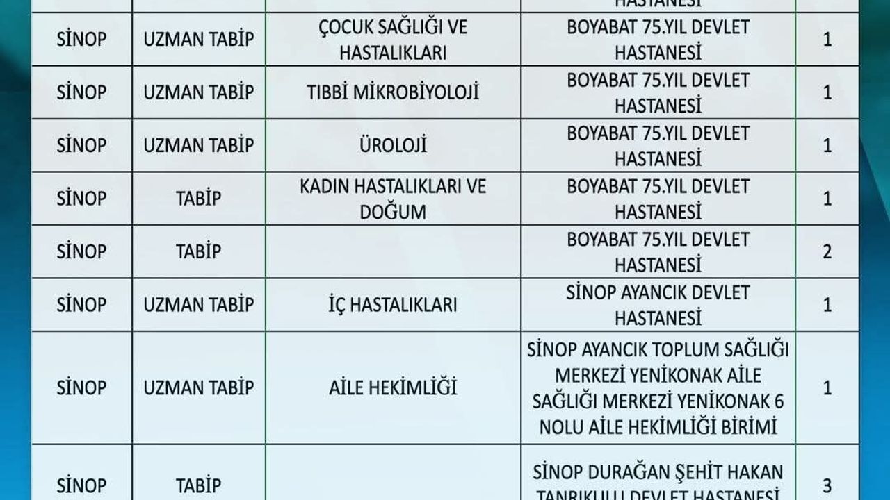 Sinop Atatürk Devlet Hastanesi: 1 kadın hastalıkları ve doğum uzmanı, 1 iç hastalıkları uzmanı. Boyabat 75. Yıl Devlet Hastanesi: Deri ve zührevi hastalıkları, acil tıp, çocuk sağlığı ve hastalıkları, tıbbi mikrobiyoloji, üroloji branşlarında birer uzman hekim; ayrıca 1 kadın hastalıkları ve doğum uzmanı (tabip kadrosu) ve 2 pratisyen tabip. Ayancık Devlet Hastanesi: 1 iç hastalıkları uzmanı.