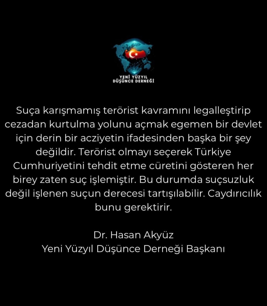Yeni Yüzyıl Düşünce Derneği logosuyla paylaşılan bildiride Dr. Hasan Akyüz, terörle mücadelede tavizsiz bir duruş sergilenmesi gerektiğini vurguladı. Akyüz, suça karışmamış terörist kavramının meşrulaştırılmaya çalışılmasını sert bir dille eleştirerek, "Bu durum, egemen bir devlet için derin bir acziyetin ifadesinden başka bir şey değildir," dedi.