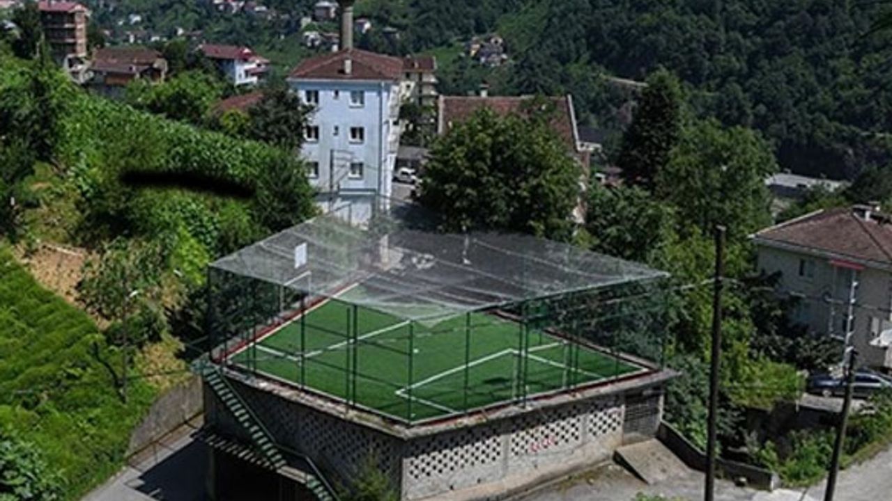 Of ilçesinde yer kalmayınca çay alım merkezinin çatısı futbol sahasına dönüştürüldü. Yamuk mimarisiyle dikkat çeken saha, hem Kur’an kursu öğrencilerinin eğlencesi oldu hem de sosyal medyayı salladı.