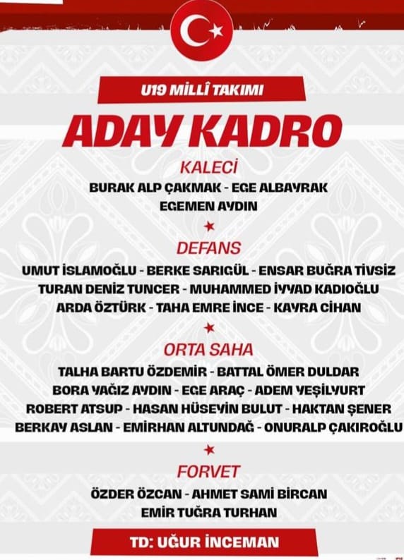 U19 Millî Takımının hazırlık kampı aday kadrosuna şu oyuncular davet edildi: